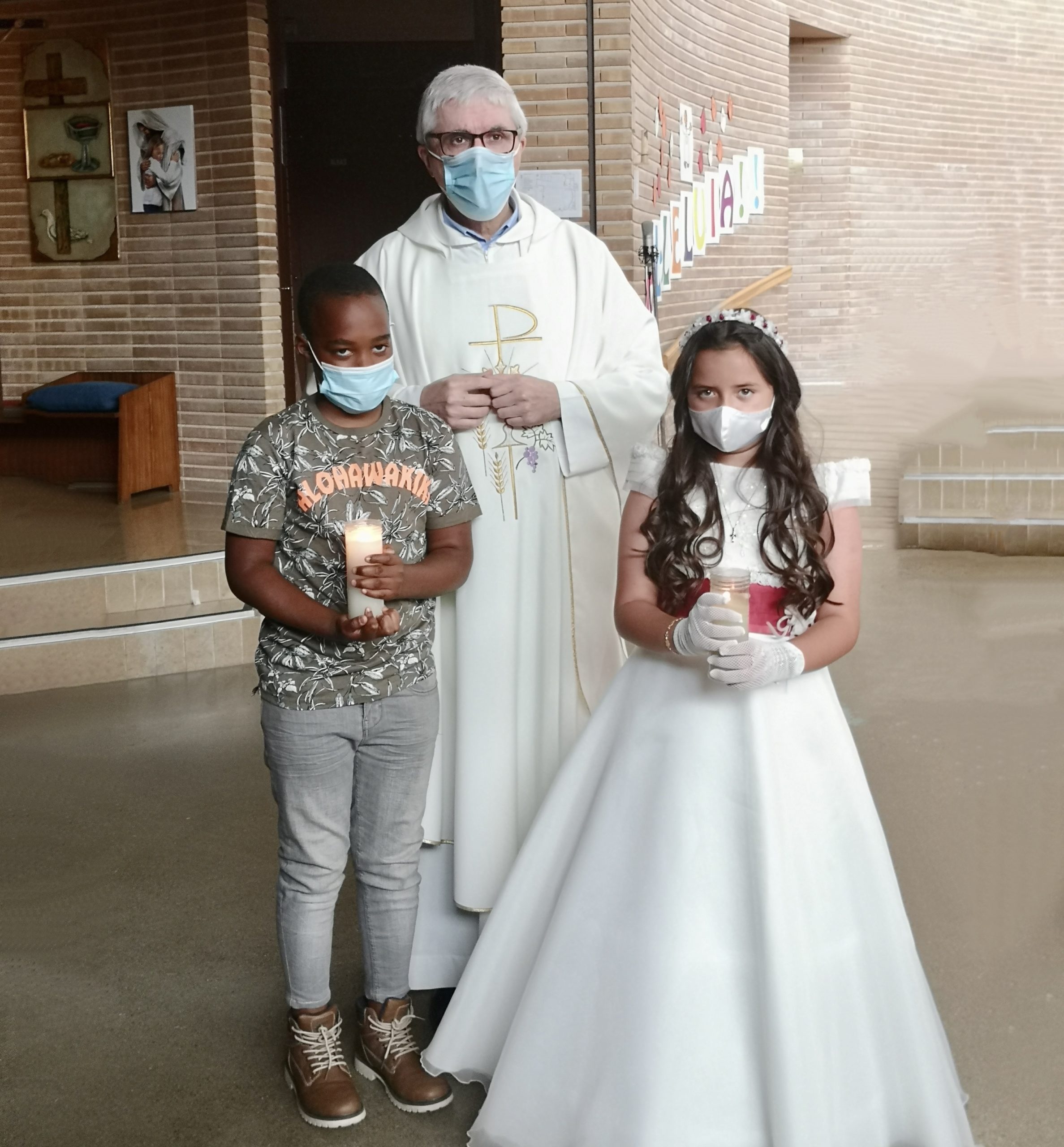 El nen HARVEY OSAIGBOSKA IYASTRE i la nena AINHOA MANTILLA FERNÁNDEZ van començar a rebre el sagrament de l’Eucaristia. Tot i la pandèmia i gràcies a l’interès i l’esforç dels seus catequistes i familiars s’han pogut preparar per aquest bell dia.