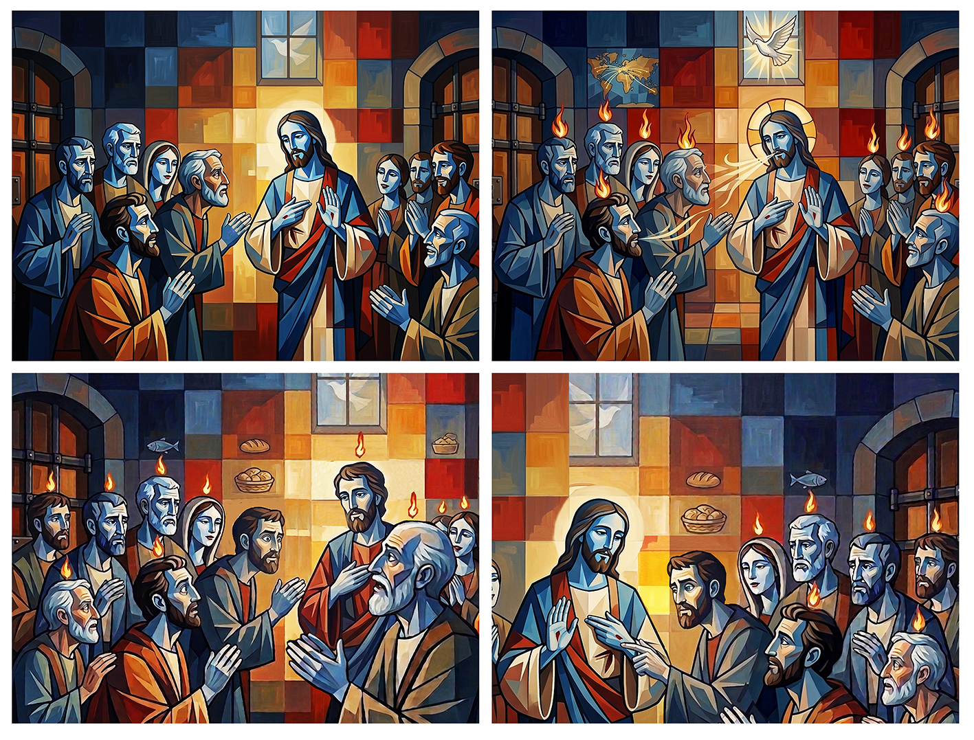 El vespre d’aquell mateix diumenge, els deixebles eren a casa amb les portes tancades per por dels jueus. Jesús entrà, es posà al mig i els digué: «Pau a vosaltres». Després els ensenyà les mans i el costat. Els deixebles s’alegraren de veure el Senyor. Ell els tornà a dir: «Pau a vosaltres.