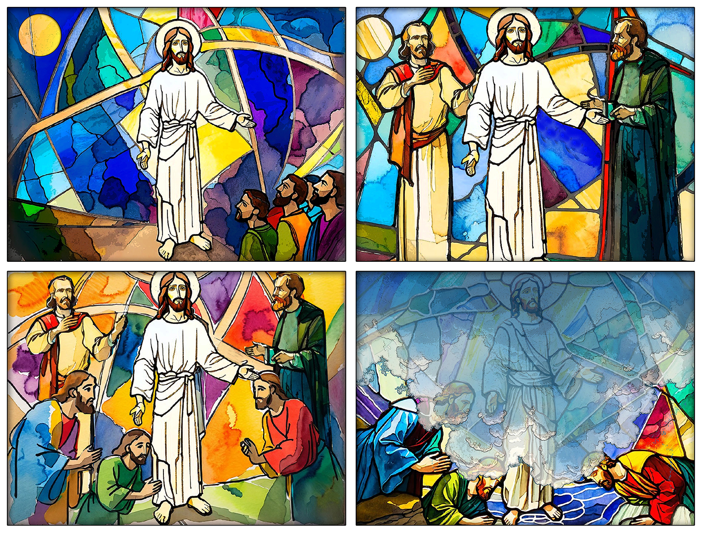 En aquell temps, Jesús prengué Pere, Joan i Jaume i pujà a la muntanya a pregar. Mentre pregava, es trasmudà l’aspecte de la seva cara i el seu vestit es tornà blanc i espurnejant.