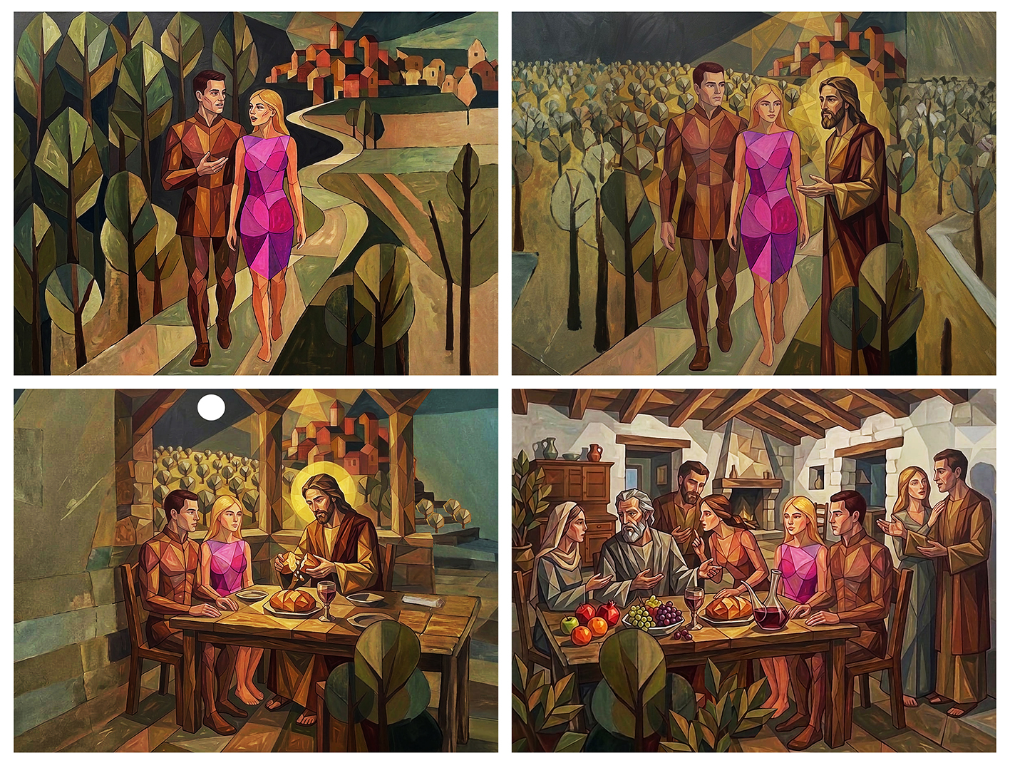 Aquell mateix diumenge dos dels deixebles de Jesús se n’anaven a un poble anomenat Emaús, a onze quilòmetres de Jerusalem, i conversaven entre ells comentant aquests incidents.