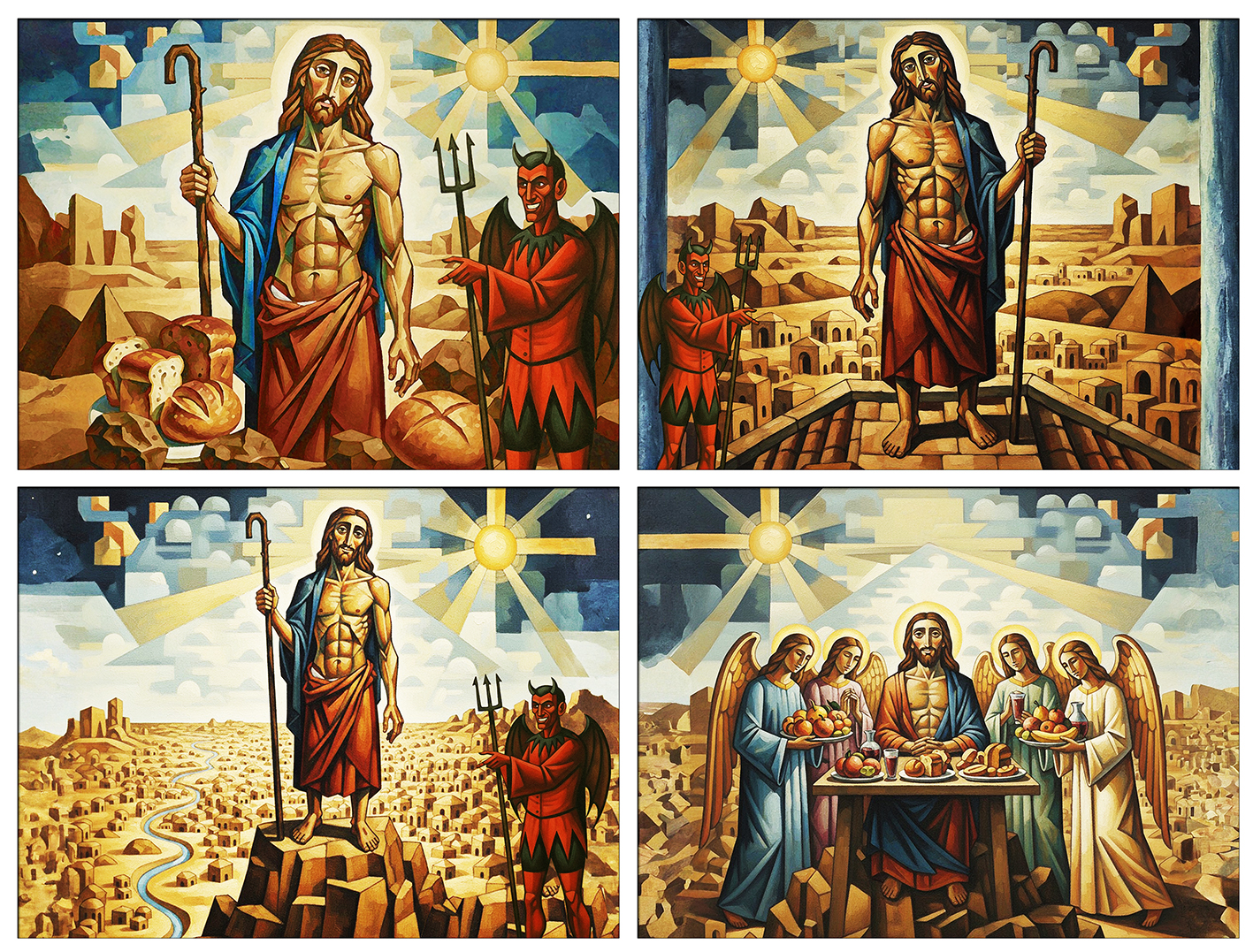 Després el diable se l’enduu dalt una muntanya altíssima, li fa veure tots els reialmes del món i la seva glòria i li diu: «Tot això t’ho donaré si et prosternes i m’adores». Llavors li diu Jesús: «Ves-te’n d’aquí, Satanàs! L’Escriptura diu: “Adora el Senyor, el teu Déu, dona culte a ell tot sol”».
