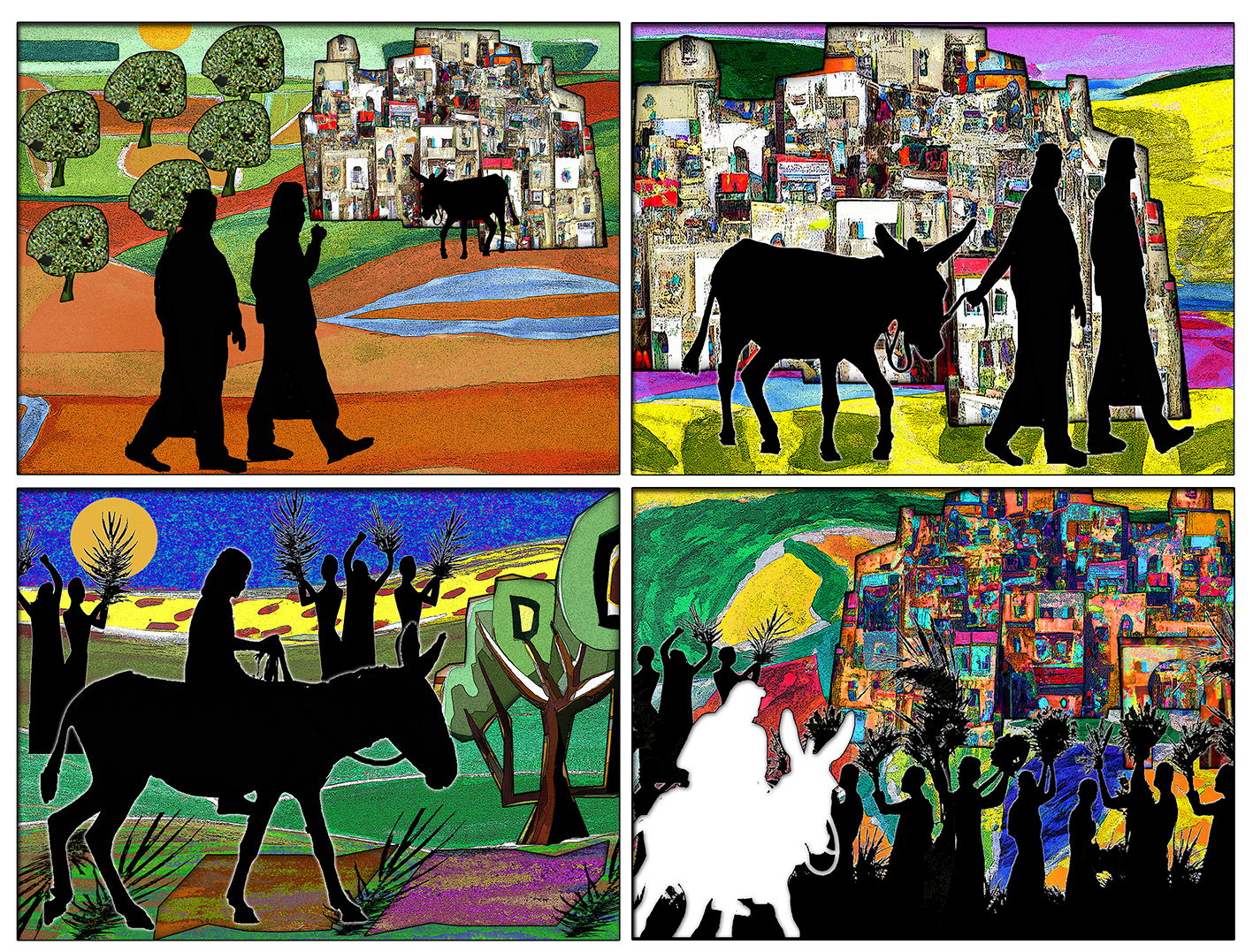 Quan s’acostaven a Jerusalem, vora Betfagé i Betània, cap a la muntanya de les Oliveres, Jesús envià dos dels seus deixebles amb aquest encàrrec: «Aneu al poble d’aquí al davant, i així que hi entrareu trobareu un pollí fermat, que ningú no ha muntat encara. Deslligueu-lo i porteu-lo. Si algú us preguntava: Per què ho feu?, digueu-li: el Senyor l’ha de menester, i de seguida el tornarà aquí.»