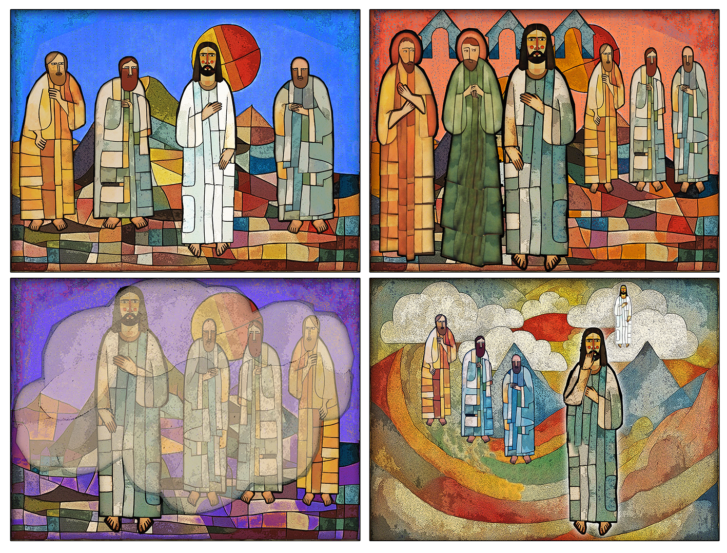 En aquell temps, Jesús prengué Pere, Jaume i Joan, els dugué tots sols dalt d’una muntanya alta i es transfigurà davant d’ells: els seus vestits es tornaren fulgurants, i eren tan blancs que cap tintorer del món no hauria pogut blanquejar-los així.