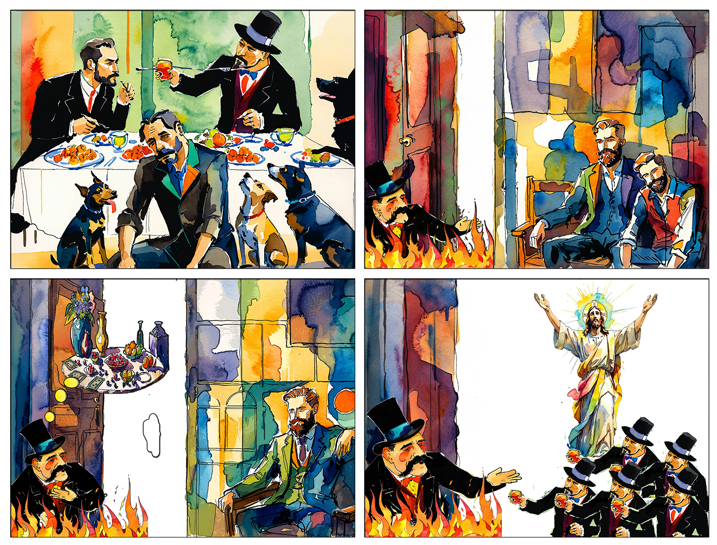 Arribat al país dels morts i estant en un lloc de turments, alçà els ulls, veié de lluny Abraham, amb Llàtzer a la falda, el cridà i li digué: “Abraham, pare meu, apiada’t de mi i envia Llàtzer que mulli amb aigua la punta del seu dit i em refresqui la llengua, perquè sofreixo molt enmig d’aquestes flames”.