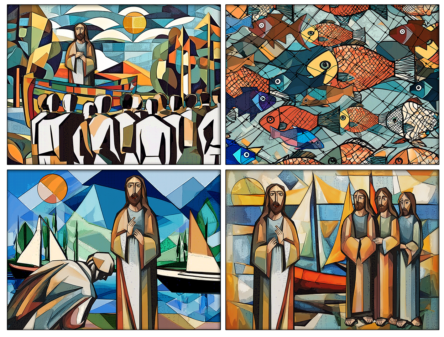 En una ocasió la gent s’aglomerava sobre Jesús per escoltar la paraula de Déu. Ell, que es trobava vora l’estany de Genesaret, veié dues barques a la platja. Els pescadors n’havien baixat i rentaven les xarxes. Pujà en una de les barques, que era de Simó, li demanà que l’apartés una mica de terra, s’assegué i ensenyava la gent de la barca estant.