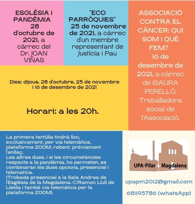 Seguint el programa de tertúlies per a l’Esperança i en l’Esperança organitzades per la UPA Pilar-Magdalena, dijous 18 de novembre va tenir lloc la segona tertúlia d’aquest trimestre. Tenint en compte les circumstàncies sanitàries actuals, aquesta sessió va tenir un format mixt: un determinat nombre de persones assistiren de forma presencial a la sala Andrea…