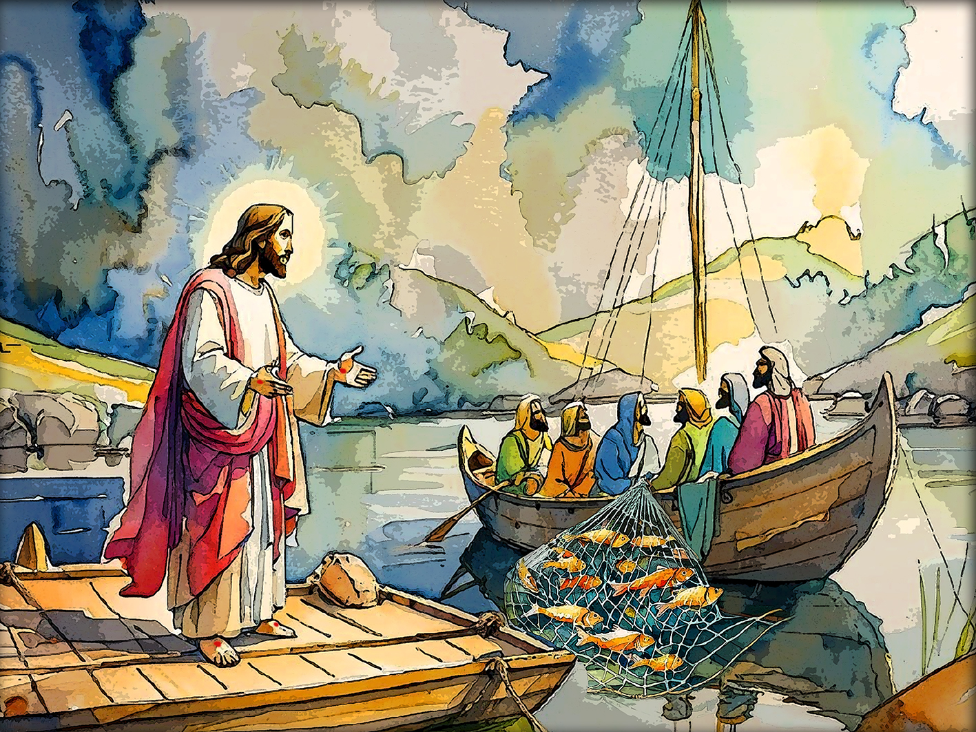 Jesús s’apareix als deixebles vora el Llac. De nou es trobaven tots. Pescant junts,